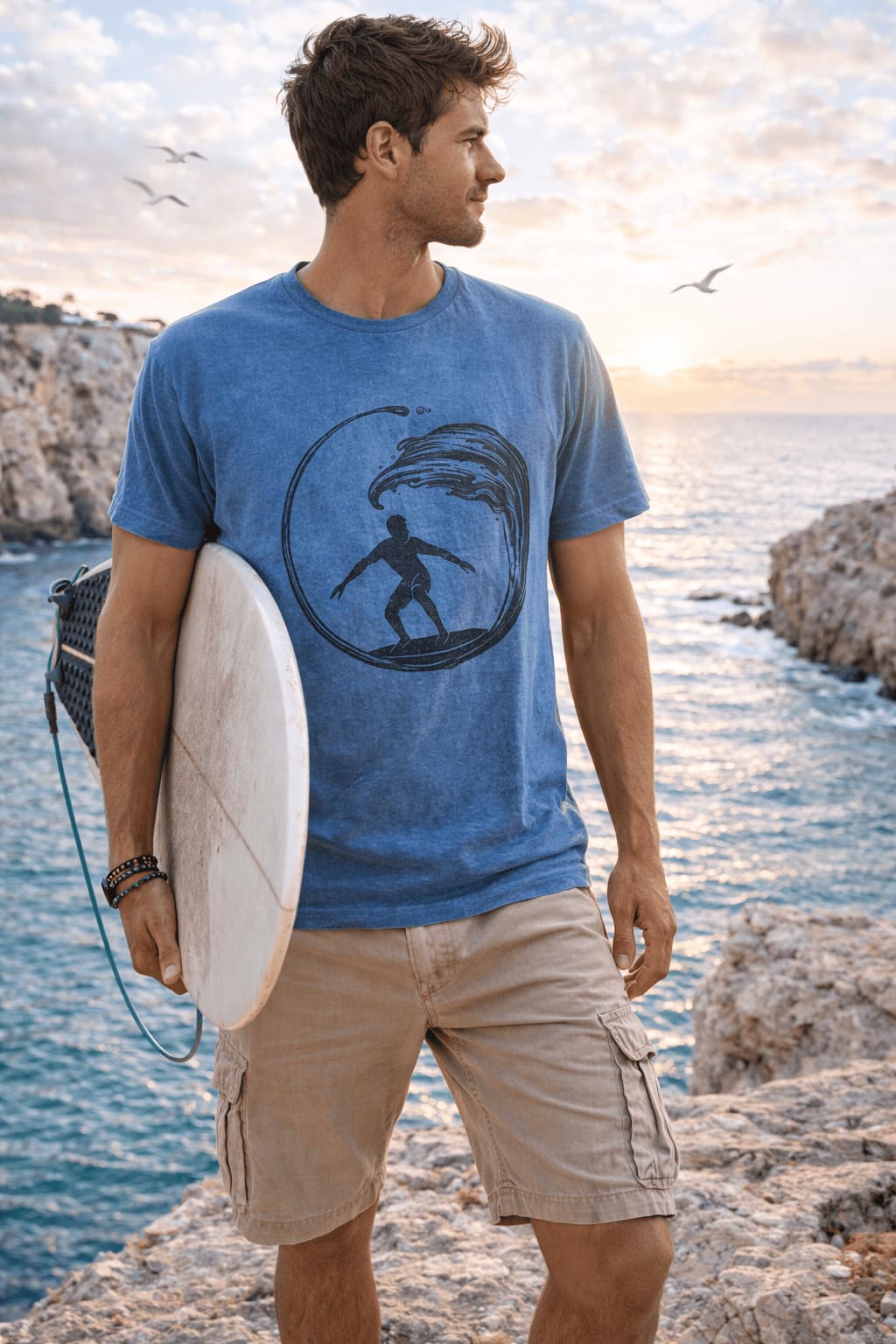 camiseta de manga corta y cuello redondo en algodón 100%, tintada en prenda con una técnica de lavado a la piedra que le da ese tono desgastado que hace que cada prenda sea única y a la vez le da un toque muy agradable y confortable.