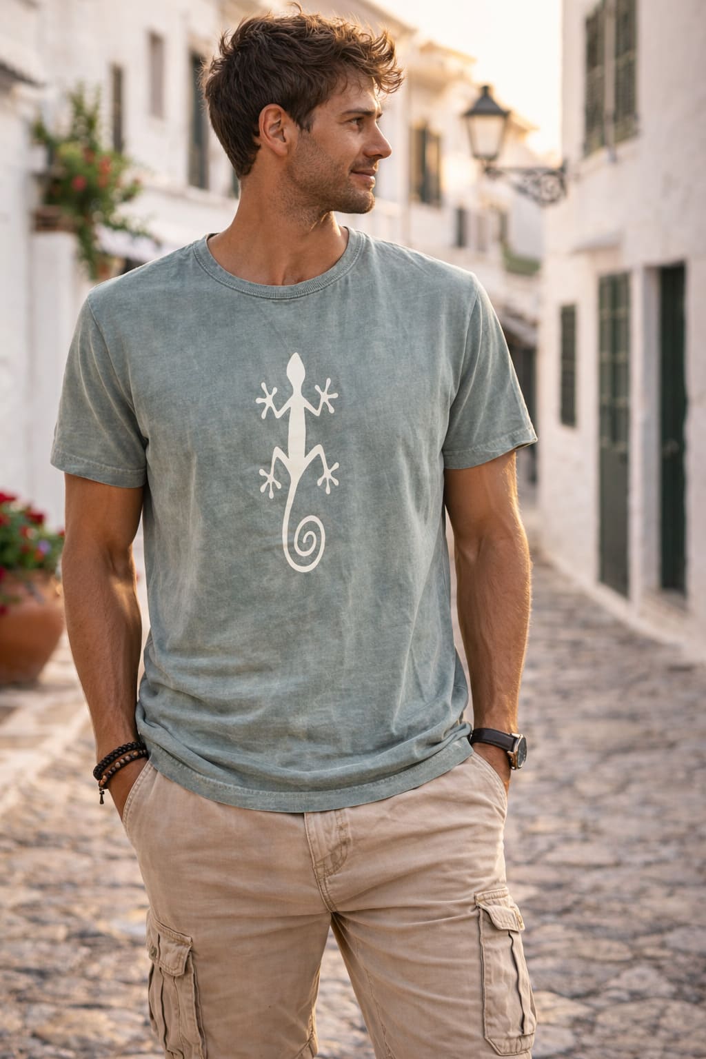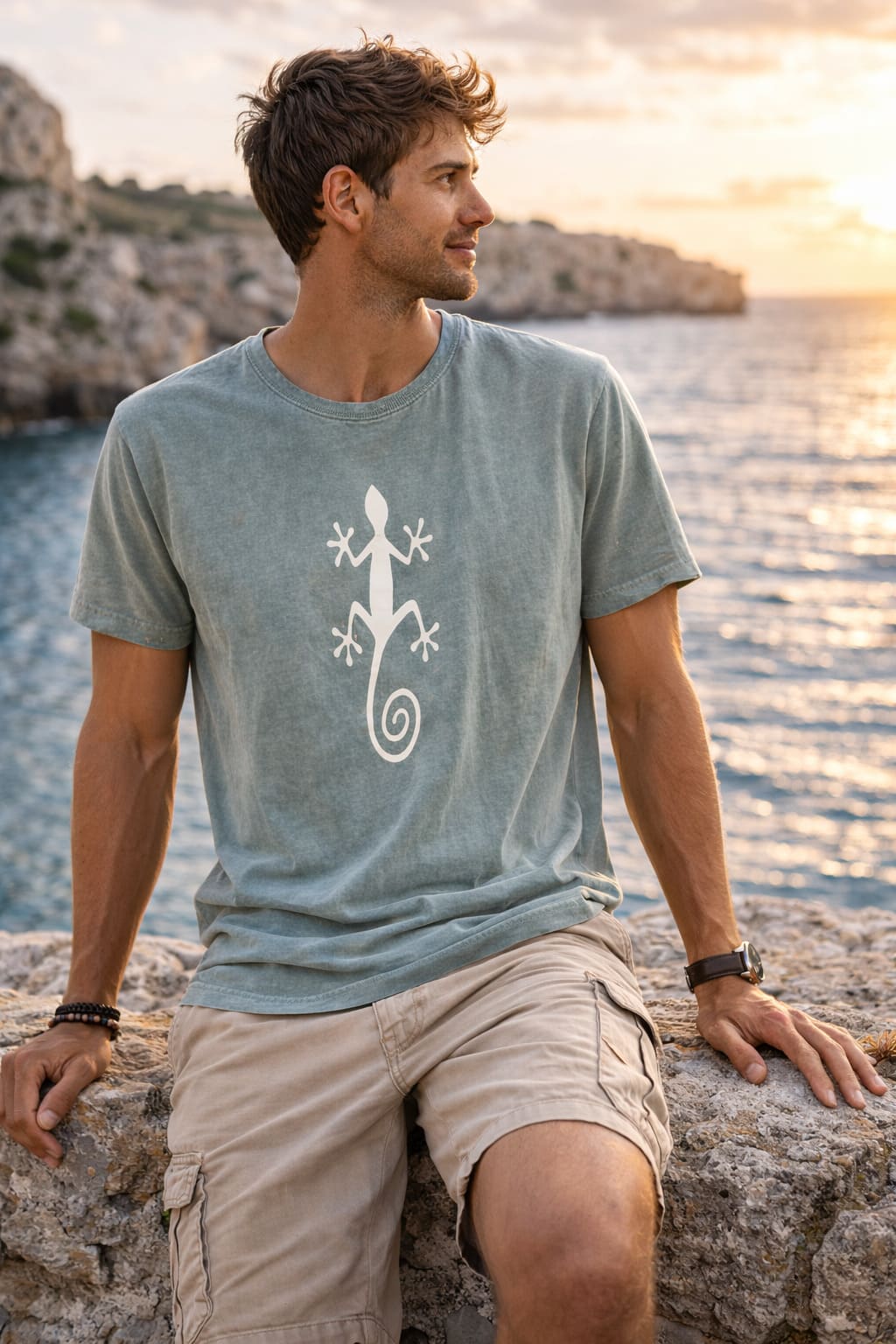 camiseta de manga corta y cuello redondo en algodón 100%, tintada en prenda con una técnica de lavado a la piedra que le da ese tono desgastado que hace que cada prenda sea única y a la vez le da un toque muy agradable y confortable.