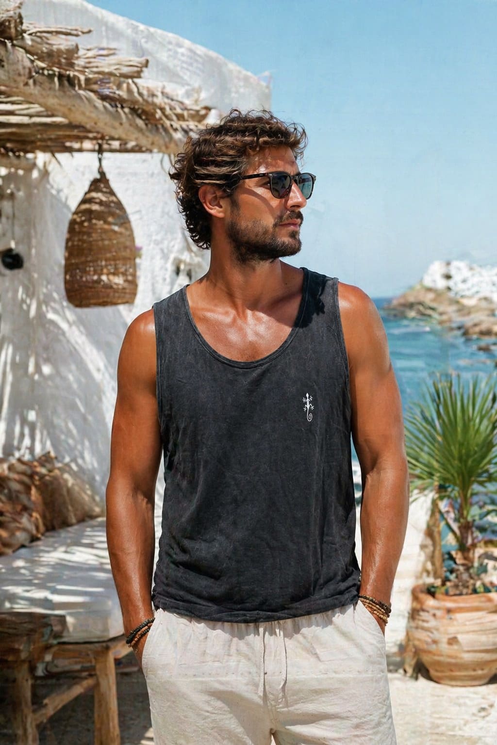 camiseta de tirantes en algodón 100%, tintada en prenda con una técnica de lavado a la piedra que le da ese tono desgastado que hace que cada prenda sea única y a la vez le da un toque muy agradable y confortable.
